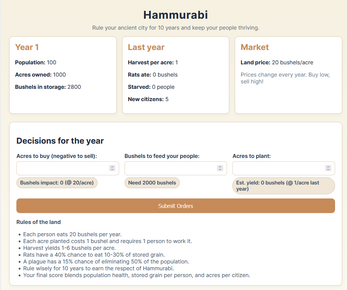 Step into the sandals of Hammurabi, ruler of ancient Sumeria, in this addictive, text-based strategy classic, now playable instantly in your browser.